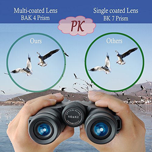 COMPACT ROOF PRISM 10X42 BINOCULAR — 10X power magnification and 307ft/1000yds large field of view, specially designed for out of doors activities such as climbing, hiking, driving, watching wildlife and scenery. This power also can be utilized for watching large stage play, vocal concert, a football game, And the like