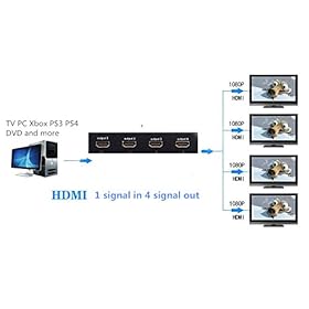 Movcle HDMI Splitter Lets You Use A couple of Screens with One Single HDMI Source Watch your video content on four displays at the same time the usage of this 1×4 HDMI Splitter. It features an internal amplifier, which boosts the HDMI signal and allows using longer than the normal HDMI cable runs. The splitter also has the ability of buffering and amplifying, and can achieve long distance transmission of HDMI signal of up to 50 meters.
