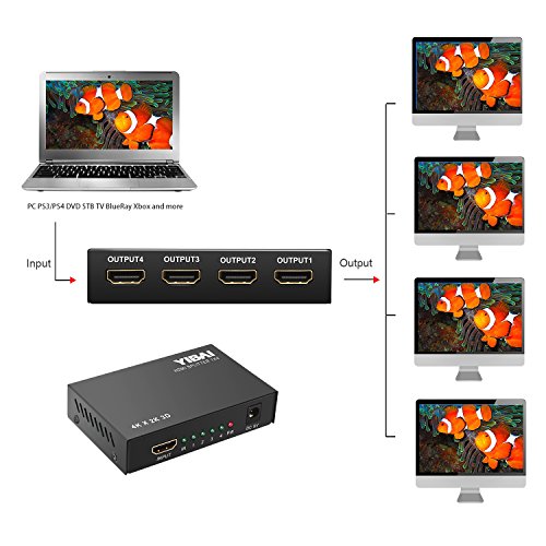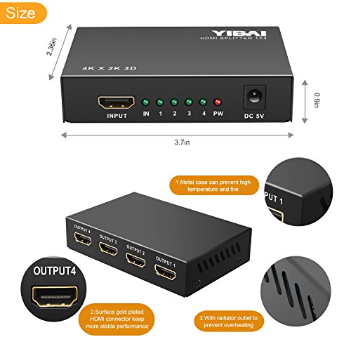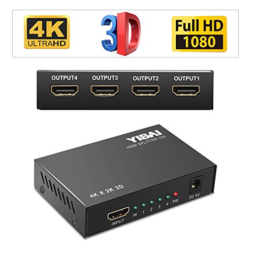HDMI Splitter, YIBAI 4K HDMI Splitter 1 in 4 out Ver 1.4 Certified for Full HD 1080P & 3D Support With US Power Adapter