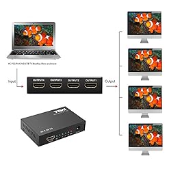 Feature: Duplicate and boost the HDMI source from 1 source to 4 outputs Support HD video signals over long distance broadcasting smoothly Supports 3D(All units connected to the splitter outputs should Reinforce 3D) Reinforce audio format: LPCM,Dolby-AC3, DTS7.1, DSD/Dolby True HD/DTS-HD master audio . Reinforce video color format: Deep Color 480i/ 576i/ 480p/ 576p/ 720p/ 1080i/ 1080P/3D /4K x 2K Simple appearance looks decent and elegant Suitable for: hdmi splitter with wired Xbox 360, Xbox One, Playstation 3, Playstation 4, Beamer, DVB receiver, TFT monitor, HD In a position or Full HD TV, Blu-Ray, DVD or HD-DVD players and so forth Specifications: Color: Black Input: 1 Way Output 4 ways Dimension(L x W x H): 3.7 x 2.36 x 0.9in Net Weight:3.88ounces Max bandwidth: 225MHz Power adapter format Input:AC(50/60HZ):100V-240V,Output: DC 5V/1A Package List: 1 x HDMI Splitter 1 x 5V Power Adapter 1 x User Manual