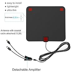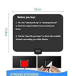 Prime amplified indoor hdtv antenna makes your life free, get rid of cable tv, enjoy your favorite channels without paying a cable fees. Specifications: 1) size:13*11.8*0.02 in 2) working frequency : Vhf(170-240mhz) uhf(470-860mhz) 3) compatible with 720p, 1080i, 1080p/ atsc 4) power supply connector : Usb 5) impedance : 75Ω 6) coaxial cable : 13.2ft length 7) connector type : F male 8) polarization : Linear 9)voltage:5v 10)accessary :Amplifier installation steps: Step 1: Stick the antenna on the window/wall/lay flat on the table step 2: Connect the antenna to ‘ant in’ on the back of any digital-ready tv or the set-top box. Step 3: Scan channels by selecting ‘menu’ then ‘channel search’ and enjoy your free tv. Choose the right antenna: Check the distance to the nearest broadcast tower to select the right antenna. Check how many available channels in your area on antenna point website. Channel reception will vary based on broadcast in your area. If the digital tv antenna is not working as expected, pls try the following tips: 1. Pls make sure you have as it should be connected the digital tv antenna to your hdtv or third-party hd receiver. 2. Re-scan for channels: In the tv’s setup menu, set the mode to indoor tv antenna or air. Refer to the tv manual for detailed instructions. 3. Reposition the indoor tv antenna in a different location. It is suggested place it higher on a wall or closer to a window. Infrequently moving a few feet can make a difference. 4. Keep the tv antenna away from those big power consumption devices interference, such as air conditioner, refrigerator and microwave oven,etc. 5. This is an amplified hdtv antenna. If a signal cannot be received with the external amplifier, remove the amplifier and check out again. 6. At all times understand that re-scan for channels after moving the antenna.