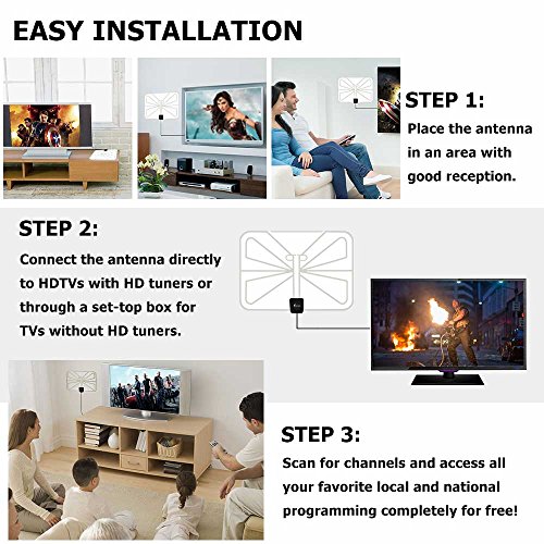 CLEAR 1080P HD RECEPTION — Please first visit “antennaweb.org” or “antennapoint.com” to check how many broadcast towers surrounding you within 50 miles. Enjoy crystal clear HDTV shows, 720p, 1080i, 1080p | ATSC available. HDTV antenna pulls in hundreds of crystal clear digital & HD shows! Receives free HD channels including ABC, CBS, NBC, PBS, Fox, Univision and more.