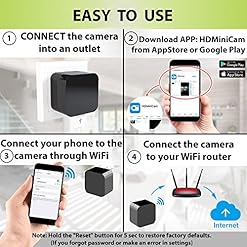 Use the hidden camera for security in hotels, as a nanny cam, simply to monitor your empty house or apartment even as you’re away at work or on vacation. Please Note 1. This camera reinforce 2.4G WiFi router, doesn’t reinforce 5G WiFi. 2. APP is available only for Android and IOS, can’t work with Windows phone. 3. Keep the camera plugged in for remote view or record. 4. For recording on Micro SD Card, choose “All Day” or “On Alarm”. Read Before Setup Mode 1 – Direct Connection Mode, it works when you’re near the camera. Step 1: Download the APP : HDMiniCam (Close the APP after downloading) Step 2: Open settings and find Wi-Fi device Called “CMXXXXXXXXXXX” on your phone and connect it. No password needed, just click and connect. Step 3: Open the APP, you are going to see your camera successfully added. Then You’ll see live video in the APP. Mode 2 – Remote View Mode (make sure that your network has a DHCP server, it means all devices get automatic network settings) Important : You will have to finish setup for 1st mode, then You’ll setup mode 2. Step 4: Open the APP, locate setting icon – Device Settings – WiFi Config, then you are going to see a WIFI list in the APP. Choose your own WIFI and enter password. Step 5: Wait for a 2-3 minutes and the camera gets back online. If not, close the APP and reopen it. If the camera is still offline, please reset the camera then repeat all the steps above. And just be sure you type correct password from your WiFi network Notice: Format your SD card, then install your SD card, please ensure that the camera found your SD card. Check it as follow: Setting>> SD Card Config in the app to double confirm SD card is detected.