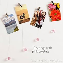 WHAT’S IN THE BOX – 1 plastic bar with holes for clips, 13 strings with pink crystals, 30 metal clips for hanging media