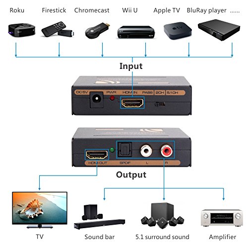A Perfect Solution: Designed to split 5.1CH/2CH audio from HDMI device like PS3/4, Chromecast, Blu-ray player, cable box, Fire TV, Apple TV, and so on. Perfect to make use of if your receiver/sound bar/surround system does not have HDMI input. Note: Not toughen HDMI ARC (Audio Return Channel)