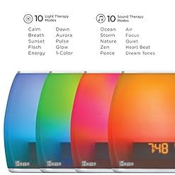 Create a calming environment for sleep or an energizing atmosphere for waking with this engaging combination of light and sound therapy. The iZBT10 features 10 diff erent sound therapy tracks designed to calm your mind, lower your breathing and heart rate, and get ready your body for sleep. You’ll also choose from a total of 11 diff erent 1000 Lux, full-color light therapy and decor lighting modes including 3 designed to align your circadian rhythm at night and 3 to give a boost to your energy levels and mood whilst you get up. The iZBT10 features four diff erent audio sources: built-in sound therapy, Bluetooth wireless audio streaming from your mobile device, FM radio and Aux-in jack (aux-in au-dio cable included). Dual alarms mean you can wake to Bluetooth, FM radio or built-in sounds at separate times. 1 Amp USB charging port to charge mobile devices. Light+ Sound Therapy Features Built-in sound therapy with 10 loosen up-ing sound modes with Tone Adjust EQ: Zen,Dream Tones, Ocean, Storm, Nature, Heart Beat, Center of attention (pink noise), Air (brown noise), Quiet (white noise)and Peace (white noise + tones) 11 Light Therapy patterns: Alarm Flash(fl ashing blue lights), Sleep Breath(slow pulsing red light), Sunset (tran-sitioning yellow to red lights), Morning time(transitioning purple to blue lights) Aurora (swirling rainbow spectrum), Calm (swirling red and orange lights) Energy (swirling blue and white lights) Glow (solid rainbow spectrum), Hold(holds last color shown), Pulse (fast changing spectrum) and Lamp (default maximum bright warm white light)