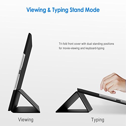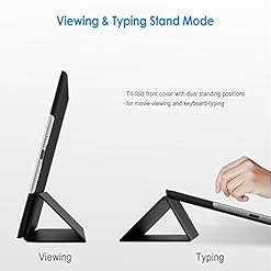 Magnetic smart cover supports automatic sleep/wake function. The tri-fold front cover can support iPad in two standing position for viewing and typing
