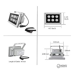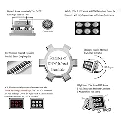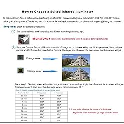 Gently Reminder: The 850nm infrared light of illuminator, after power it on if you look straightly at the lens of ir illuminator, it is advisable to see the dark red glow on each and every ring of lens, but YOU could NOT SEE any light emitting from it To give protection to the sensor, please install the senor head down to steer clear of direct sun exposure Camera and Illuminator must be installed to the same horizontal and vertical direction For after service and technical toughen, please mail us [email protected]. We are in a position to assist you JCHENG IR Illuminator, when the view angle of lens of illuminator is wider, the IR distance will be shorter.Moreover, the practical IR distance and view angle would be in spite of everything influenced by the focal length of lens of your camera. Please carefully check with our specification chart before buy Technical Data: 1.Infrared Leds: build in 6 pieces of high power IR Array LEDs 2.Field View: 60°-80° 3.Power Consumption: 6W 4.Infrared Distance: 65-75 feet (20-22 meters) 5:Type of Infrared Light:850 nm wavelength 6.Housing Colour: Grey 7 Dimensions:in Mm (L / W/ H): 114*89*99 8.Main Cable Length: 19.7inches/50cm 9.Working Type of Photocell Sensor: Auto (turn on automatically when the light is lower than 10lux) 10.Protection Class (waterproof and dust proof): IP67 11.Gross Weight: 430g; Net Weight:385g 12.Working temperature: – 20 degrees c to + 50 degrees c 13.Housing Material: fine aluminum and reinforced glass 14.Adapter / Transformer: input ac 100 – 240v, 50 / 60hz; outcome: dc12V, 1A; the power supply plug size: 5.5 x 2.1 mm, male (adapter / transformer is included) 15.Package Content: 1 x 6-Led IR Emitter1 x 1A power supply