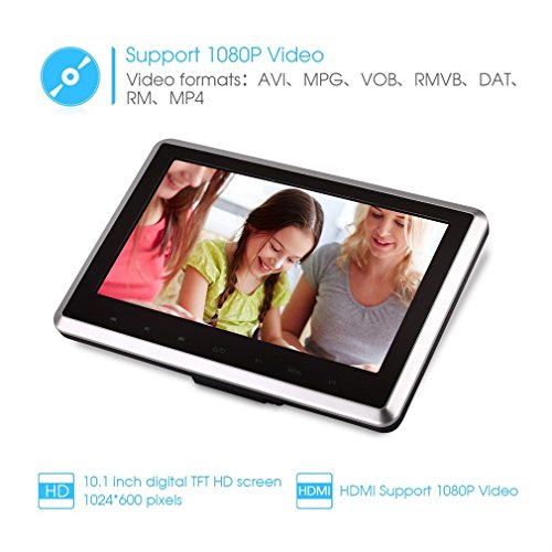 ►Support 1080P videos:10.1″ 1024*600 TFT LCD Screen (Hitachi lens) with 16:9 wide view angle,auto search system:PAL/NTSC.The headrests can play the same movies(only DVD mode) when you connect them together by AV input and output cable, otherwise they will work separately.The video of installation:https://youtu.be/5JqQnDgYSoE.