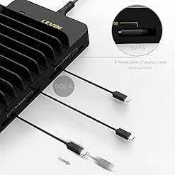 10-Port, 60W Powerful Station: 4 Charging ports(4x1A) with built-in retractable cables on Side A, 6 Smart USB charging ports(0~2.4A) on Side B. Allows you to charge up to 10 devices including smart phones and tablets simultaneously in a compact space.