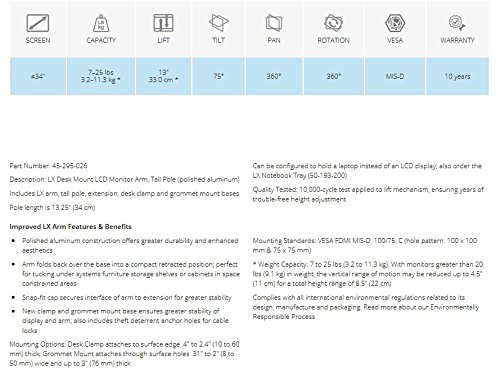 Durable polished aluminum construction! Tested to accomplish 10 times the anticipated life cycle of competitive offerings at a greater price. Sleek and streamlined, the LX Arm frees up space and allows positioning of your display for greater productivity. Reposition you LCD with only a touch. Up, Down, Forward and Back the LX provides unparalleled range of motion.