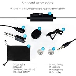 INCLUDED: 1X Lavalier Microphone (236 in cable); 2x Button Batteries (one for backup); 1x Adapter(3.5mm-6.5mm); 1x Metal Clip; 1x Wind Muff; 1x Manual