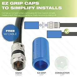 Connectors: Nickel plated F-type connectors. Complimentary Removable East Grip Connector Caps simplify installation onto F-Female. Easily got rid of by sliding off if not desired.