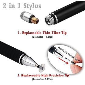 ABOUT THE STYLUS: Length:5.5″(140mm); Pen tube diameter 0.35″(9mm); Disc diameter: 0.27″ (6.8mm) including 2mm rubber point ; Fiber tip Diameter:0.24 (6mm); Weight: 24g — Made from stainless steel and Aluminum, no plastic parts, real pen feeling