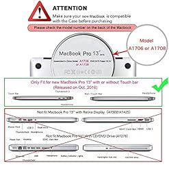 Designed to suit The Newest MacBook Pro Retina 13 Inch (A1706 with Touch Bar and A1708 without Touch Bar, Release October 2016).