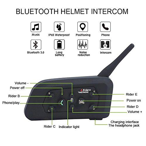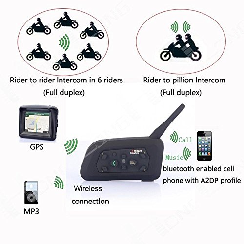 Support 6 riders connection, 2 riders talking at the same time,1200 meters(3,280 feet) maximum talking range,full duplex wireless communication,up to 120Km/h working speed,up to 8 hours talk time,150 hours standby time.