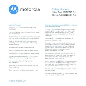 Model MB8600 is a DOCSIS 3.1 Cable Modem certified by Comcast XFINITY, Comcast Business, and Cox Communications. Owning your own modem typically saves $120 per year in cable modem rental charges. MB8600 supports ultra fast DOCSIS 3.1, the only cable modem standard that can deliver internet speeds of 1 Gbps or higher, up to many gigabits per second. Actual speeds depend on your cable modem service and the speed of your Ethernet LAN ports. MB8600 also has 32×8 toughen for the fastest conceivable speeds the use of the DOCSIS 3.0 standard. Despite the fact that you don’t have DOCSIS 3.1 service now, you’ll have the benefit of the 32×8 DOCSIS 3.0 capability that’s also built into this cable modem. The MB8600 provides high-speed Internet for a pc, router, HDTV, game station, or streaming media device. To give simultaneous Internet access to many devices, plug in any router you like. MB8600 features low latency, for the fast response needed for many interactive games. MB8600 has 4 GigE LAN ports and supports Ethernet Port bonding on 2 ports, essential for delivering 1 Gbps and higher speeds. Your top actual speed is just under 1 Gbps without bonding, just under 2 Gbps with 2 ports bonded. For bonding to increase your modem’s speed to about 2 Gbps or more, your router also needs to toughen bonding. MB8600 includes DOCSIS 3.1 Active Queue Management (AQM), which speeds page loads, gaming, and video conferencing. DOCSIS 3.1, 3.0, 2.0, and 1.1 toughen and Cable Labs certification ensure compatibility with services nationwide. Setup is fast and easy with a few easy steps in our Quick Start guide. Our experienced USA-based customer toughen specialists are ready and willing to help if you wish to have them. With Motorola extras including advanced surge and lightning protection, easy installation, a 2-year warranty, and superb customer toughen, Model MB8600 is a superb choice for customers who want the ultimate in cable modem performance. MB8600 does not include a WiFi Router or VoIP telephone adapter.