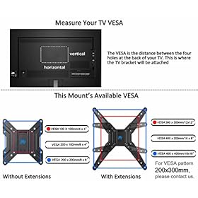 This mount fits most of 26-55″ TVs sold as of late. It fits TVs with mounting holes as close as 4″x4″ or as wide as 16″x16″ (in TV terms – VESA 100x100mm to 400x400mm). Specifically, it fits VESA 100X100mm, 200X100mm, 200X200mm, 300X300mm, 400X200mm, 400X400mm.