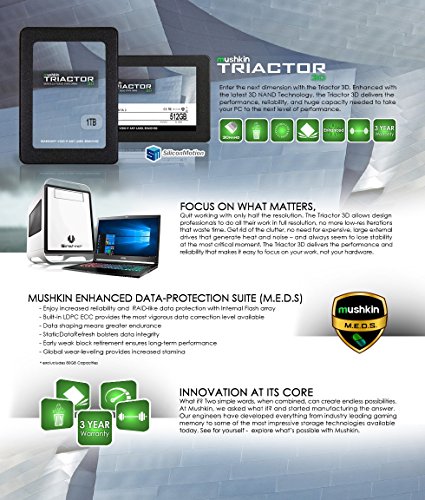 Wake up your PC’s true performance potential! Engineered in the USA, the Mushkin TRIACTOR-3D SSD leverages the latest advances in 3D TLC NAND Flash technology to provide an ultra-fast, robust and reliable storage solution..