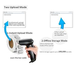 Storage mode:Scan and store barcode inside the built-in storege of the scanner and then upload the data to your device when you want it.Internal offline storage supports up to 100000 barcodes.