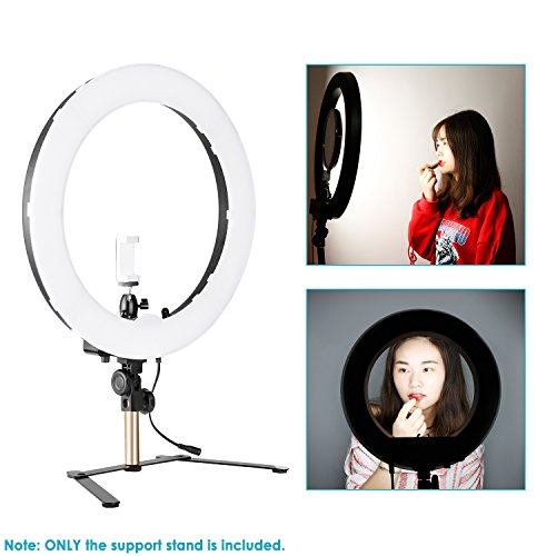 EASY INSTALLATION: Simple structure for easy to set up; Just need to unfold two black arms and the installation will be finished after you plug a ring light onto the golden head; Very simple to use