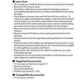 Silent Wave Motor (SWM), 77mm Filter Thread,Format Compatibility Nikon DX. Lens construction:19 elements in 14 groups (including 3 aspherical lens elements and 3 ED lens elements)