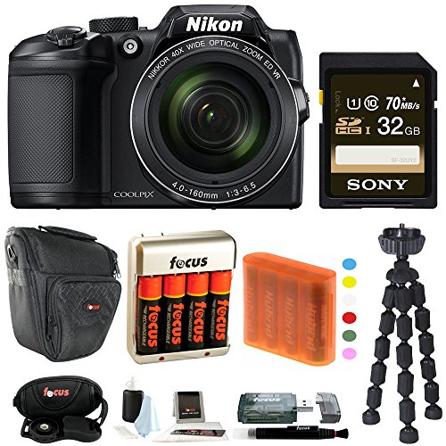 BUNDLE INCLUDES – Nikon COOLPIX B500 Digital Camera (Black) / Sony 16GB SD Card / Focus DSLR Holster Bag / Focus 5-Piece Cleaning Kit / Focus Lens Pen / Focus Card Reader / Focus Wrist Grip Strap / Focus 4-Pack of AAs & Charger / AA Storage Case (Color May Vary) / 12-Inch Spider Tripod