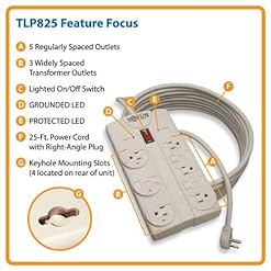 8 NEMA 5-15R outlets, including 3 for bulky transformers and 8 ft. AC power cord with right-angle NEMA 5-15P plug