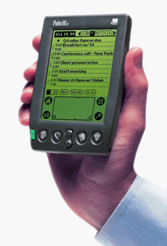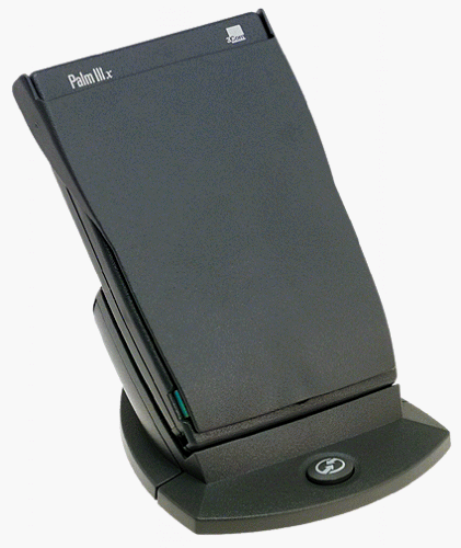 What’s in the box: Palm IIIx, Stylus, 2 AAA batteries, HotSync cradle with serial cable, DB-25 adapter, Protective cover, Organizer and Desktop applications, Handbook