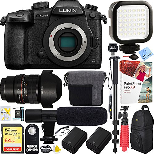 BUNDLE INCLUDES: Panasonic LUMIX GH5 20.3MP 4K Mirrorless Digital Camera with WiFi (Body), Rokinon 14mm f/2.8 IF ED MC Aspherical Super Wide Angle Lens-Olympus/Panasonic Micro 4/3, Tradewind Zoom Bag 2.1 (Dark Gray), 2x Battery for Panasonic, Corel PaintShop Pro X9 Digital Download, 64GB SDXC Memory Card, Professional Lens Blower – Dust Removal system, Lens Cap Keeper, LCD/Lens Cleaning Pen, SLR Photo and Video Rechargeable LED Light, Universal Mini Condenser Shotgun Microphone and More