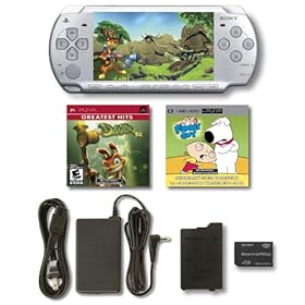 * The PSP Daxter Entertainment Pack – Ice Silver contains: The Sony PSP – Ice Silver, AC power cord, AC adaptor and battery, 1GB Memory Stick Pro, Daxter the game, and Family Guy UMD.