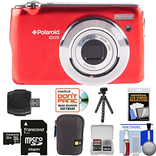 [1] Polaroid iEX29 18MP 10x Digital Camera (Red) + [2] Transcend 32GB microSDHC Card +