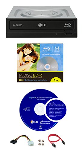 LG internal drive bundle includes a 1 pack of M-DISC BD, Cyberlink software, SATA cable, power connection cable, 4 mounting screws