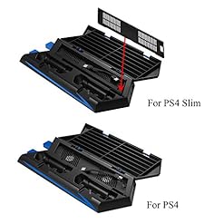 Works for PS4/ PS4 Slim- This slim stand with cooler is perfectly works for PS4 and PS4 Slim. Game console vertical stand+ cooler+ controller charging station+ USB HUB+ 14 slot game disc storage+ controller thumb grips. All-in-one, meets your entire needs.