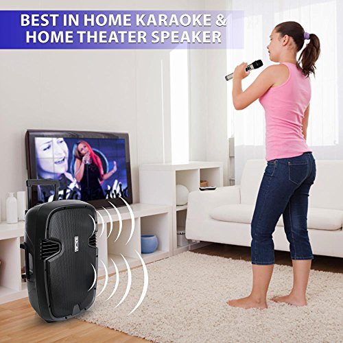 POWERFUL AND PORTABLE: This Compact and High Powered 1600 Watt Karaoke PA Sound System by Pyle is equipped with 15 inch Subwoofer and 1.34” Tweeter for Full Range Stereo Sound Reproduction and its handles and wheels make trip easy