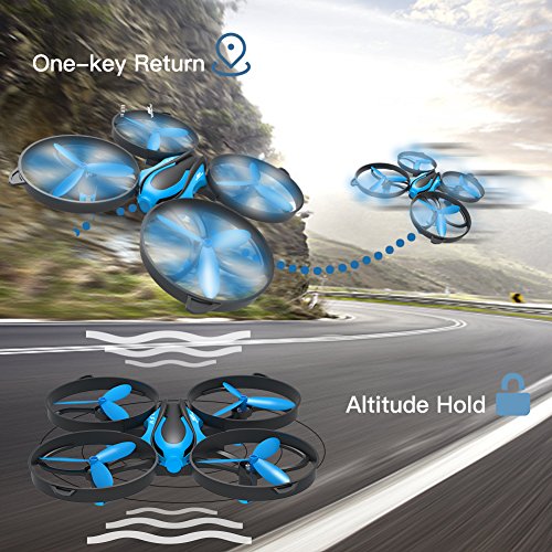 Altitude hold. You’ll be able to release the throttle stick at the same time as the drone will keep the current height. One key take off and land, super easy to fly & easy to shoot quality images or videos with wifi real-time HD carmera.