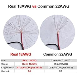 ★【Real Thick 18AWG】- Real 18AWG vs Common 22AWG, real 18AWG are bigger wire than other 22AWG pigtails, as it has heavy gauge with 43 pcs 100% copper wires per single cord, 86 pcs total for the two Red / Black cords. This makes the difference when the use of with bigger power supplies, and allows them to be used for higher current devices, they must be good to 5A or even a touch more with real 18AWG.