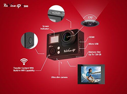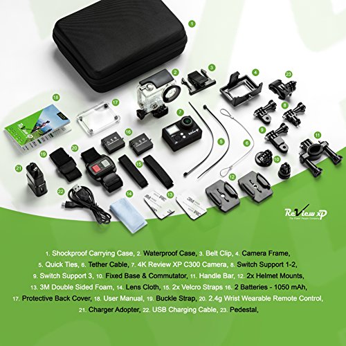 VALUED BUNDLE COMBO – 4K Review XP C300 + Shockproof Carrying Case + 2.4g Wrist Wearable Remote Control + Waterproof case + 2 Batteries (1050 mAh) with an ample array of favorable accessories including Handle Bar, 7x Mounts, 2x Helmet Mounts, Bandages, Clips, Tethers, Velcro Straps, Charger Adopter, USB Cable, Lens Cloth, User Manual – All of these accessories are compatible with Go Pro cameras.