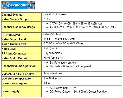 This coax demodulator is able to decode all standard NTSC channels. It can also be used for those satellite receivers with those TV2 out from satellite receivers.