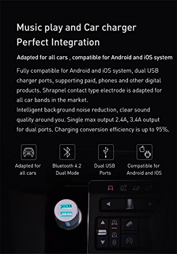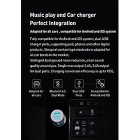 MUSIC MP3 PLAYER & CHARGING; [That is cool!] Listening music and charging at a same time; connecting Roidmi 3s ( Music Bluetooth car charger ) to Roidmi APP by Bluetooth, play music on-line or off- line automatically; Dual USB Ports 5V 3.4A can charge for two phones /Pad at a same time, single max output 2.4A,adapted to output 12/24 DC, global use