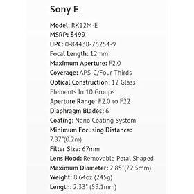 Rokinon RK12M-E-SIL 12mm F2.0 Ultra Wide Angle Fixed Lens for Sony E-mount (NEX) and for Other Cameras