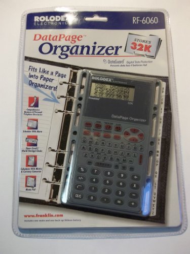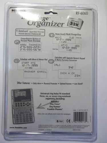Designed to suit usual notebook organizers & ultra-slender this organizer has many knowledge-saving options: telephone directories, calculator, scheduler w/alarm, world time. Password coverage, auto shutoff. uses lithium batteries (included). Prevents knowledge loss if batteries fail. Manufactured in 1999 by Franklin Electronics Publishers.