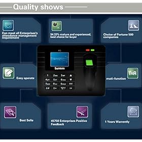 Identification Time: ≤1s; Language: English,Korean,Chinese; CPU: 32bit CPU; Log Capacity: 100,000 events; Communication: USB; Record Query: To be had(people can query their very own attendance record after authentication); Dimensions:(9.76 x 6.53 x 2.76)” / (24.8 x 16.6 x 7)cm (L x W x H).