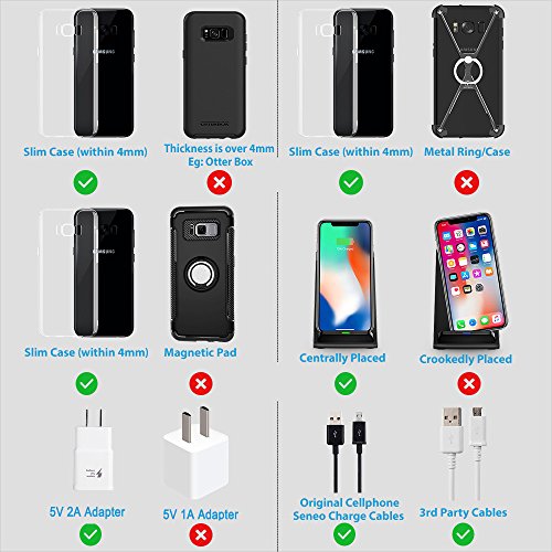 🔥【LED INDICATOR】 Seneo wireless charger will become blue for 2 seconds when it connects to the power, and will become green and stays when qi wireless charging pad starts to charge the phone; For iPhone X, iPhone 8 Plus, iPhone 8, lights will stay green even though fully charged; The blue light will flash always and stop charging if there is foreign body on wireless charger stand, like magnetic pad, metal case and phone not compatible with, etc, trying to avoid these when charging.