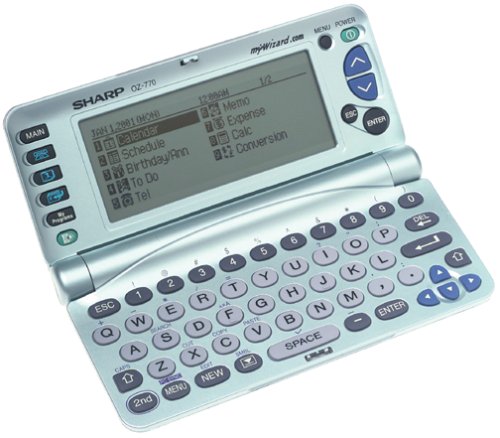 Model: Sharp OZ-770 Wizard. Memory: 3MB. Contrast regulate: Keyboard. Keyboard: 50 Keys plus directional arrows. 8 Serve as keys plus page up / page down. Ports: PC Link. Unit-to-Unit Information Transfer. Indicators: Calendar and Task Reminders. International Clock Day-to-day Alarms. Flash memory system does no longer require backup battery. Dimensions: 162 (W) x 81.5(L) x 22 (H) mm