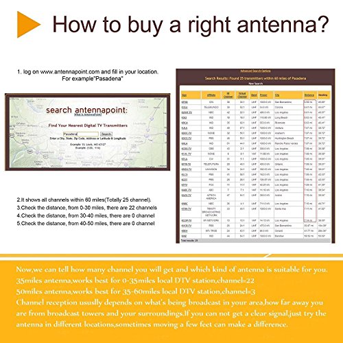 The signal of the 35miles is mainly available in the range of 30-40miles. Quality of reception may vary by channel depending on distance from broadcast tower, terrain, and other factors( Warm Tips:Before you buy, please visit:antennapoit.com to find out what channels are available in the range of 30-40miles).