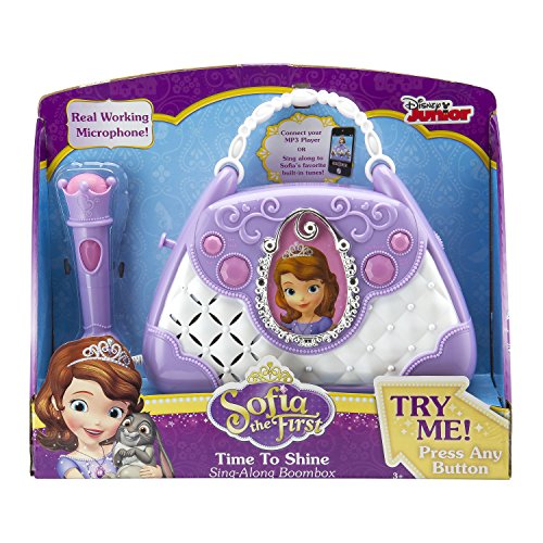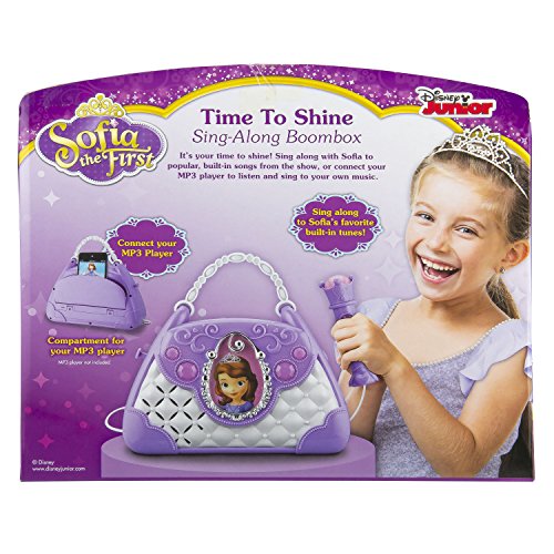 TIME TO SHINE- Seize your Sofia the First Time To Shine Sing Along Boombox and rock out on your favorite music. Sing your heart out to Sofias favorite built in tunes or your own awesome music by connecting your MP3 player.