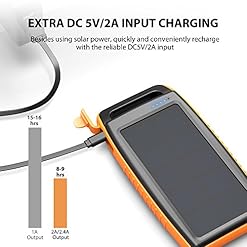 Fast Recharging from Outlet or Solar: Dual DC 5V/2A and solar power inputs mean you can recharge no matter where you are. (DC input is Advisable for faster recharging)