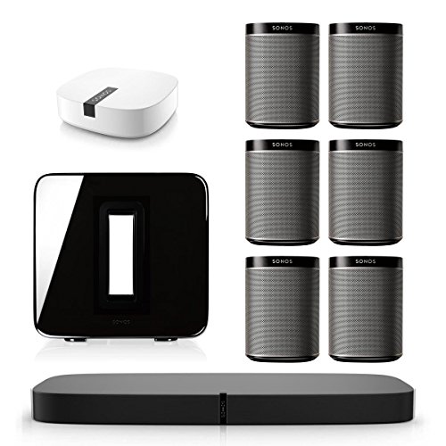 This Bundle Includes: (1) Sonos PLAYBASE Wireless Soundbase Speaker, Black, (6) Single Sonos PLAY:1 All-In-One Wireless Speakers, Black, (1) Sonos Sub Wireless Subwoofer, Black, and (1) Sonos Boost Wireless Range Extender