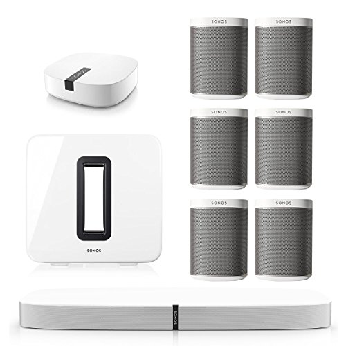 This Bundle Includes: (1) Sonos PLAYBASE Wireless Soundbase Speaker, White, (6) Single Sonos PLAY:1 All-In-One Wireless Speakers, White, (1) Sonos Sub Wireless Subwoofer, Gloss White, and (1) Sonos Boost Wireless Range Extender